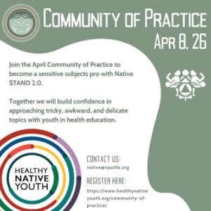 If you are not able to attend, the CoP sessions are recorded and available in our Recorded Sessions Library: https://www.healthynativeyouth.org/resources-search/?_sft_resource_audience=community-of-practice-presentations