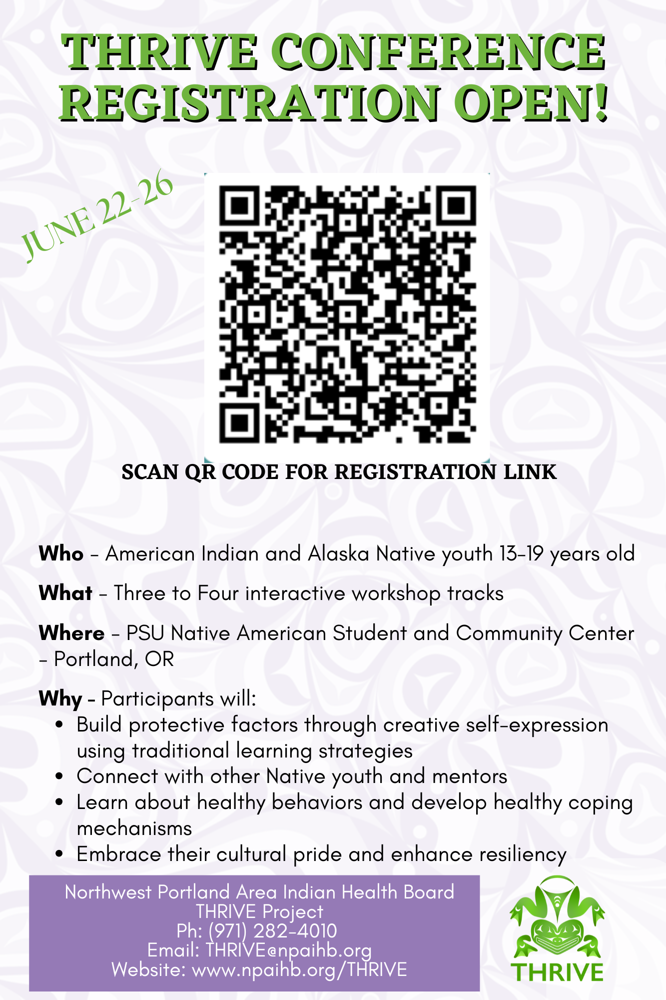 Lunches, healthy snacks, and activities are included with the free registration. Travel costs and breakfast and dinner meals will need to be covered by the Tribe, chaperones, or families, if this creates a hardship please reach out to our staff at THRIVE@npaihb.org for possible travel assistance.